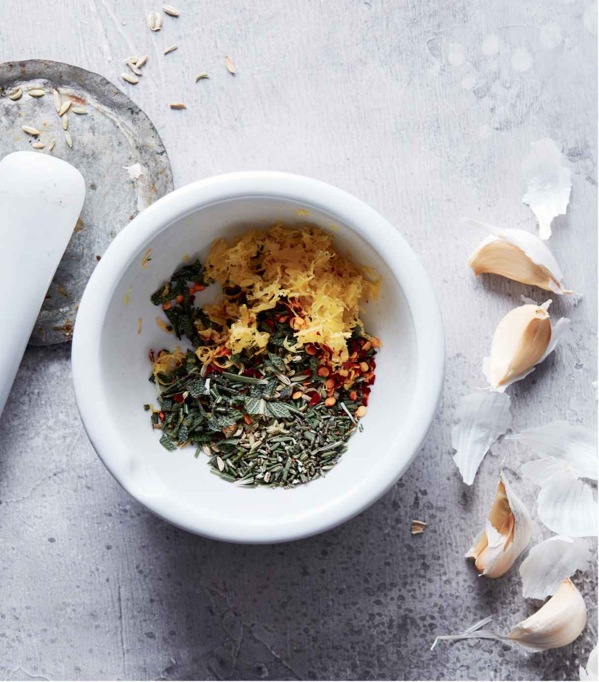 5. Transfer the dip to a serving bowl and make an indentation in the middle. Pour the remaining ¼ cup olive oil into the indentation. Garnish the dip with the remaining ½ teaspoon pepper flakes.