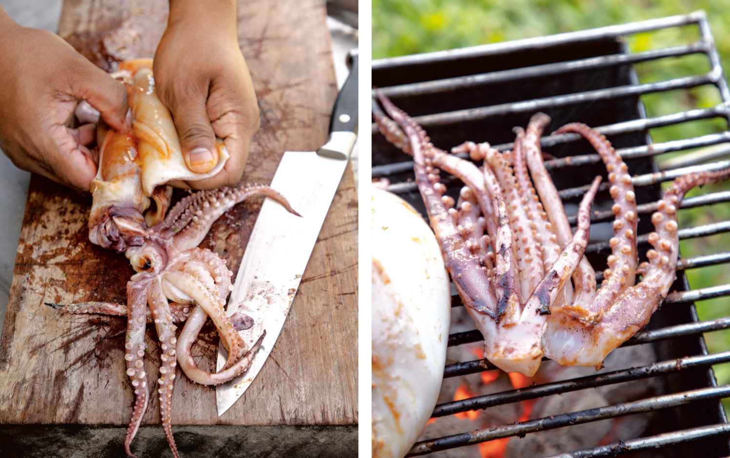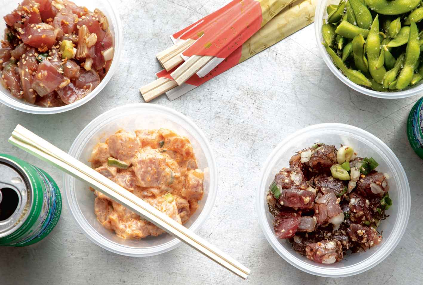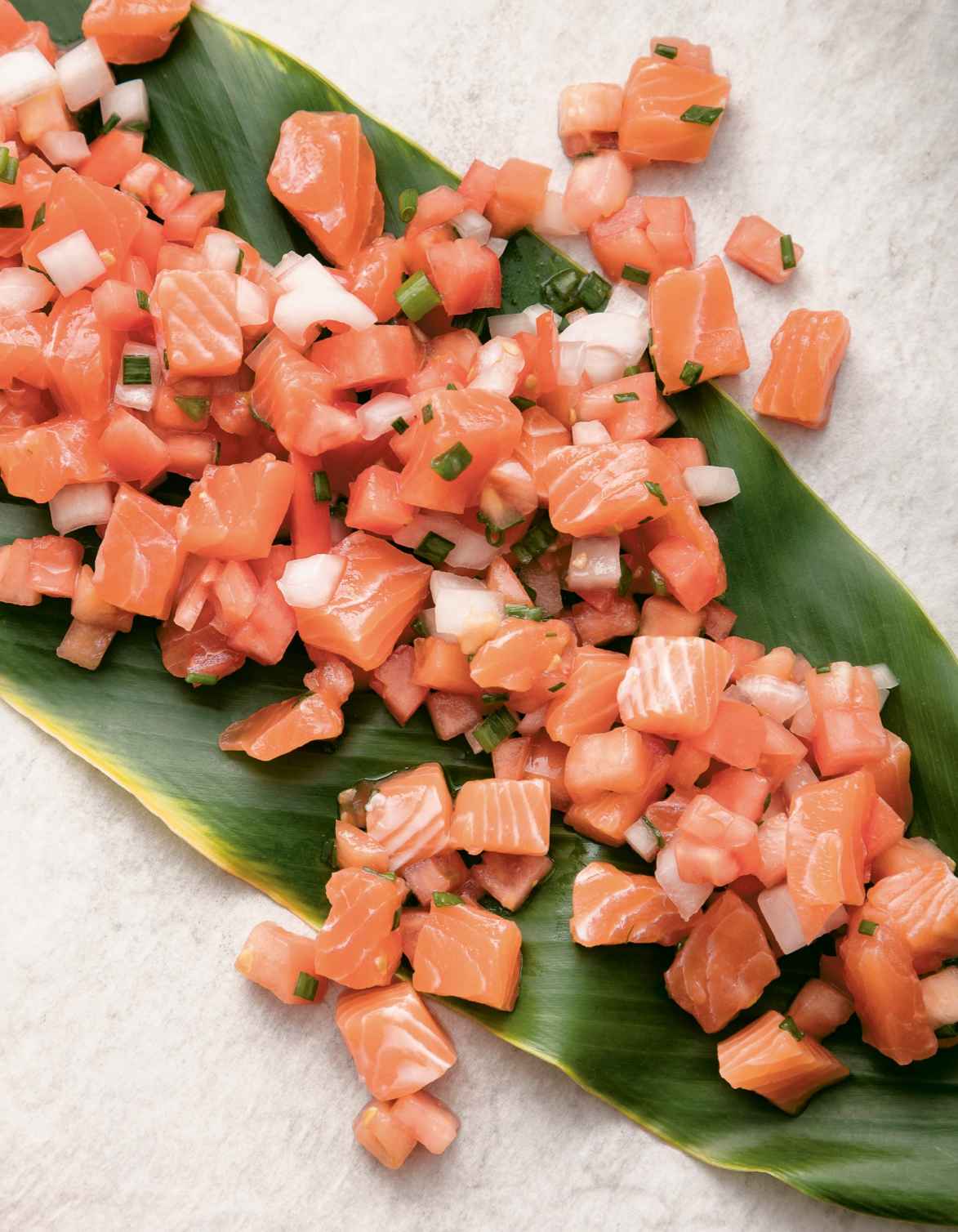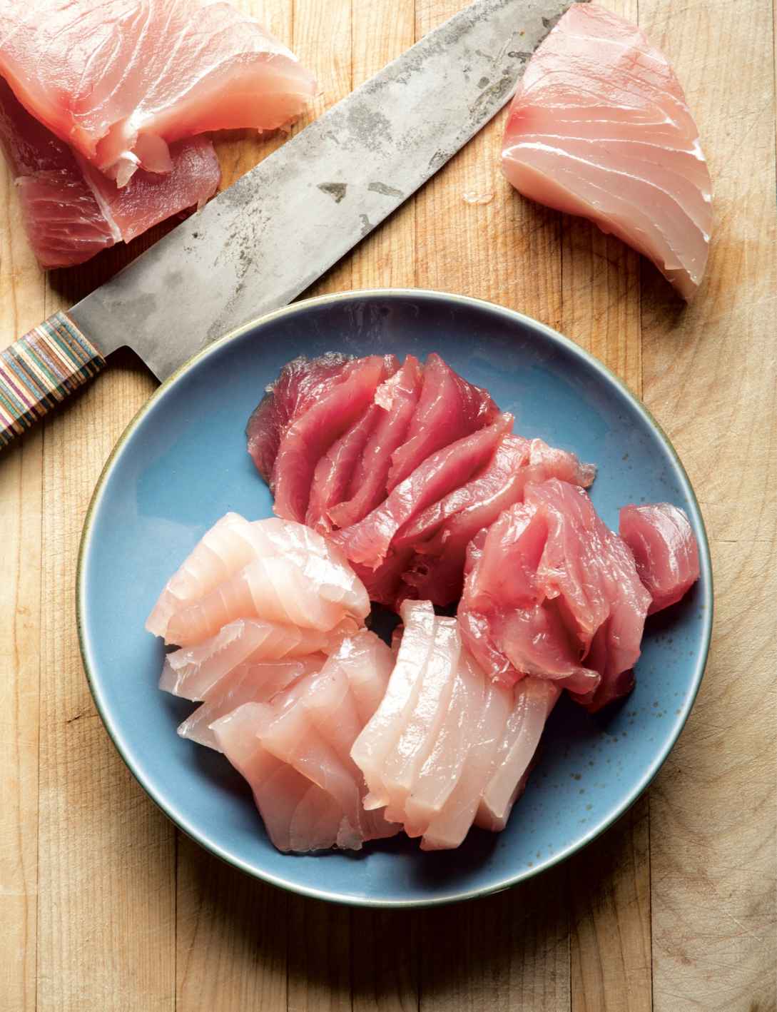 Given our position in the middle of the Pacific, encircled by powerful, nutrient-churning ocean currents, Hawaiian waters are home to a uniquely rich array of seafood, whether it’s ‘opihi (limpets) that we pry off the rocky shorelines and eat raw with chili pepper water, or bright pink kūmū (goatfish) caught fishing near the reefs. There’s a good reason why locals in Hawai‘i eat three times as much fish as the rest of America. Some of the fish called for in this book, like yellowtail or ‘ahi tuna, are commonly available on the mainland, but as a general rule it is better to use seafood that is available and recommended in your area rather than trying to track down the exact kinds we use in Hawai‘i. Ideally this will lead you to picking fish that is fresh, local, and sustainable, which to me are the three most important factors when buying fish.