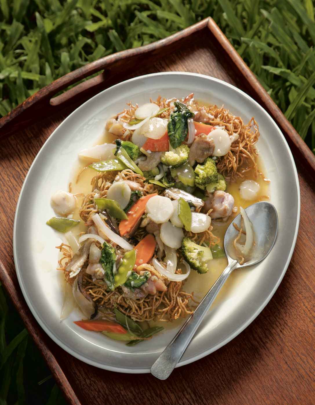 After Tin Roof, I had the chance to open another upscale restaurant in Wailea called Lineage. For me it was a chance to show that although my cooking was born of these rustic traditions, it could also be presented in a refined, contemporary way—that authenticity and creativity wasn’t an either/or proposition. Rather than focus on plate lunches like we did at Tin Roof, the concept at Lineage was to pay tribute to the special dishes you’d encounter at milestone celebrations: first birthdays, weddings, luaus, and such. There were boiled peanuts, fried noodles, smoked meat with guava jelly, cold ginger chicken, and my family’s recipe for pork and peas. We even had a roving pupu cart (welded by my dad).