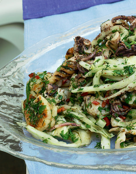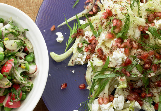 Try substituting dried cranberries or sour cherries for the pomegranate. The fennel for this salad should be the round and bulky variety. It is crispier and sweeter than the long one.