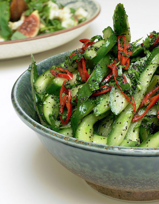 Our friend Ossi Burger says that Sami is a genius for having managed to turn something as dull as a cucumber into a delicacy in this salad. She is right about the genius thing, but that’s beside the point. What Ossi has in mind is the typical mammoth cucumber that you find in supermarkets—a cucumber with no texture, no flavor, and no character.