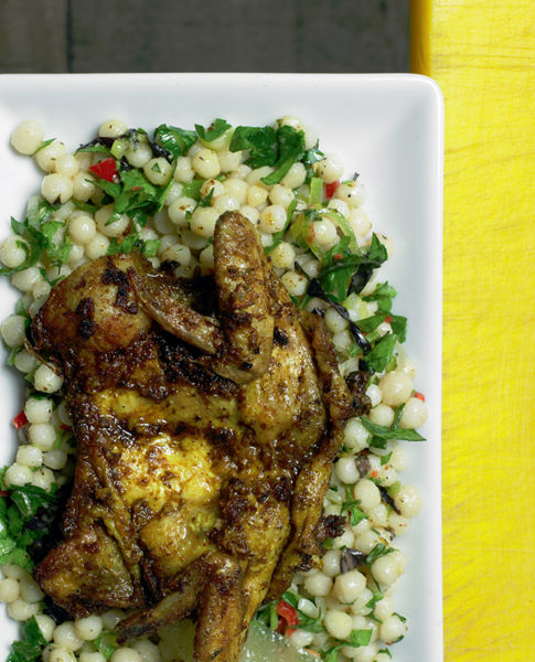 1 Start by releasing the pomegranate seeds. The best way to do it is to halve the pomegranate along its “belly” (you only need half a pomegranate here), then hold the half firmly in your hand with the seeds facing your palm. Over a large bowl, start bashing the back of the fruit with a wooden spoon. Don’t hit too hard or you’ll bruise the seeds and break the skin. Magically, the seeds will just fall out. Pick out any white skin that falls in.