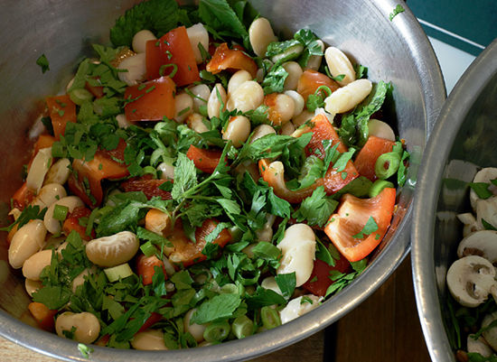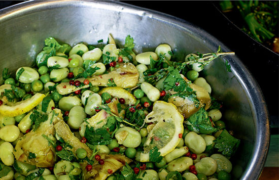 Here we come to the thorny issue of shelling fava beans. Many Arab recipes call for cooking and eating fava beans with their pods. This is recommended for young beans, early in the season, but wouldn’t work for a fresh salad like this one. Going to the next level—