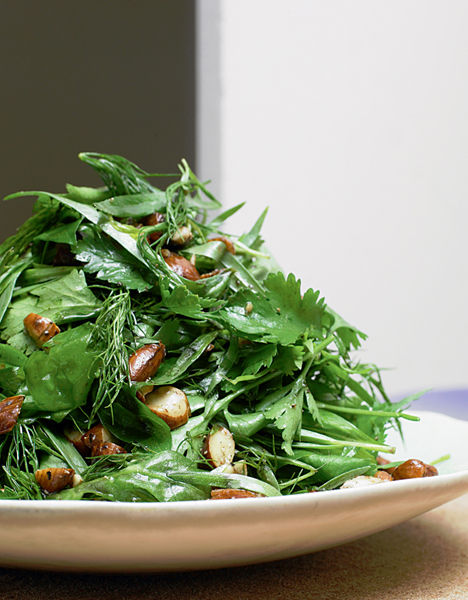 If we are totally honest, this salad is hard work. You must meticulously pick the leaves of six types of herbs, wash them carefully, and then dry well. You also have to fry almonds watchfully without burning them. And you should dress it no more than a minute, literally, before serving. Quite a headache.