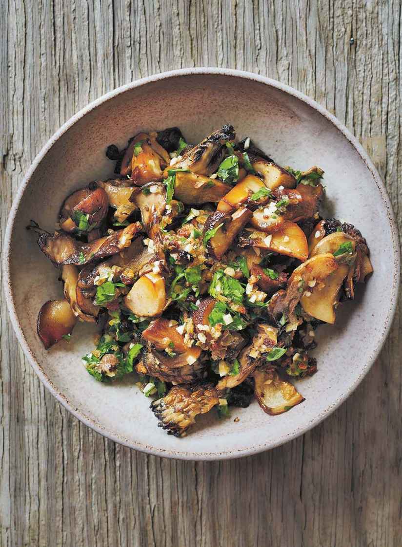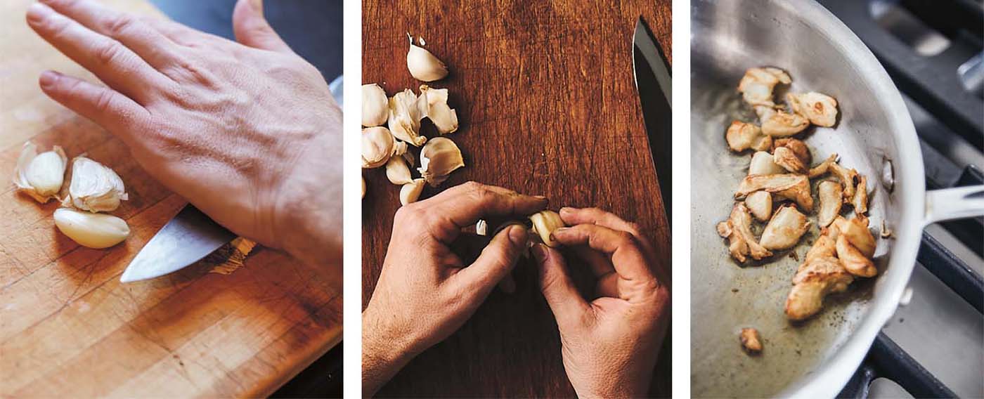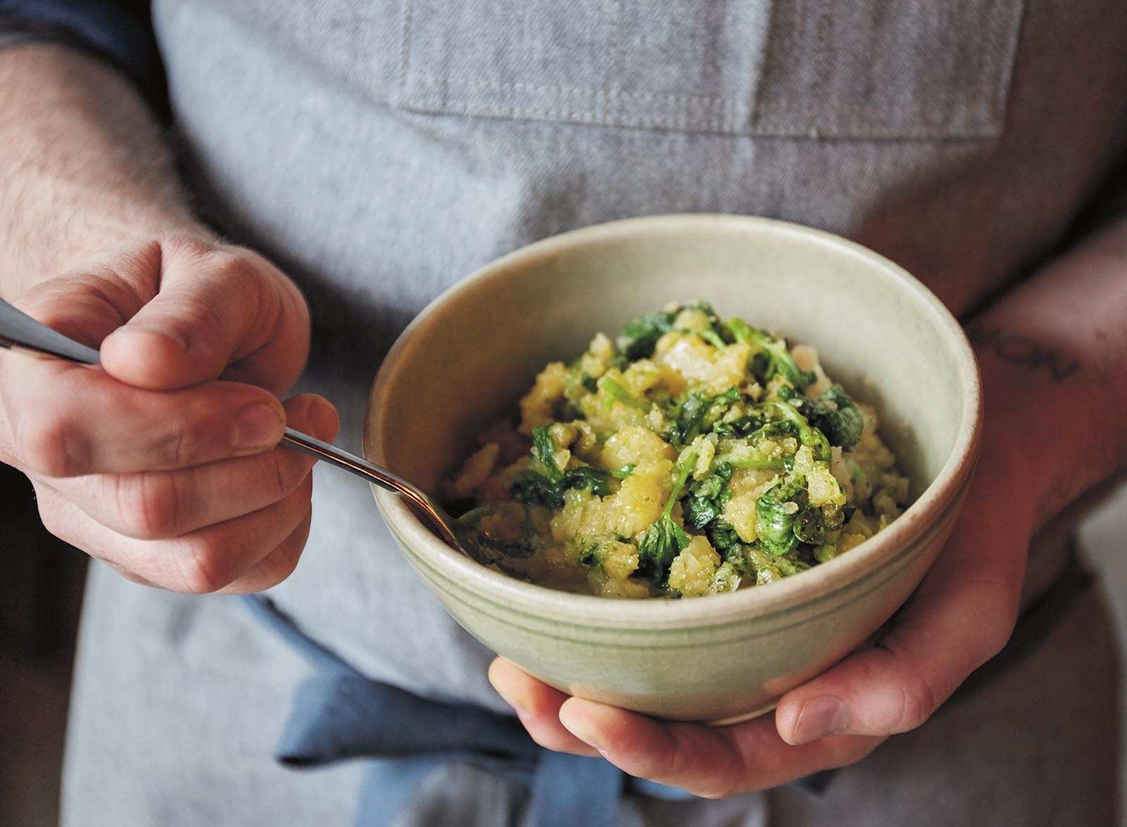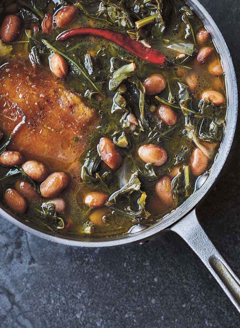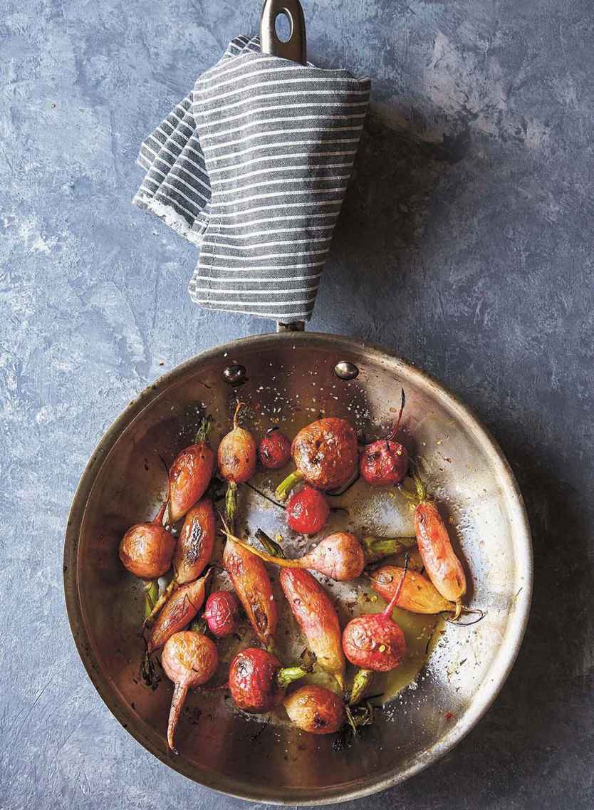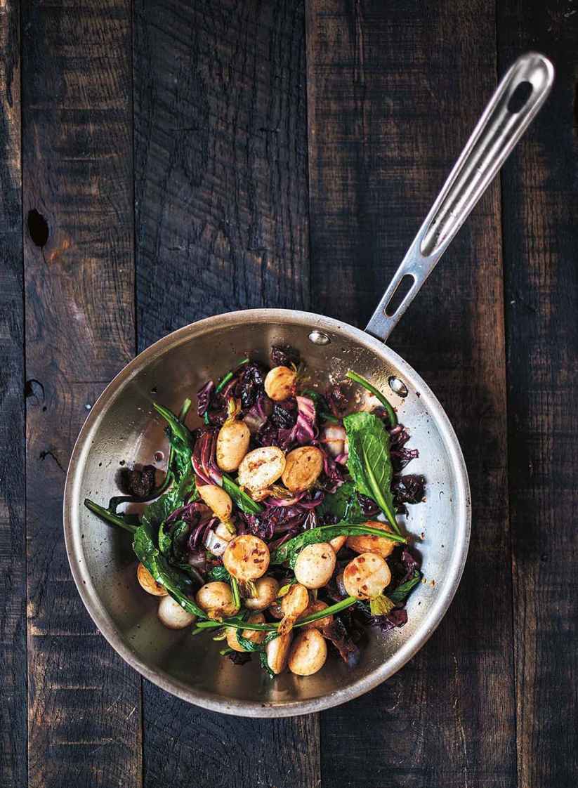 Here’s what I learned: Season (usually with salt, pepper, chile flakes, some kind of acid) before you add the fat, which in 95 percent of the recipes in this book will be olive oil. Dial in the flavors through a few rounds of tinkering, tasting, and tinkering again. The goal, says Joshua, is for the dish to taste “like a potato chip.” Meaning so tasty and savory that you can’t help but take one more bite . . . and then another.
