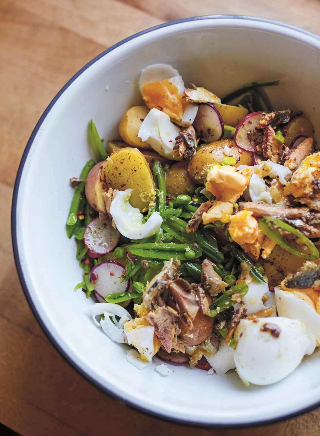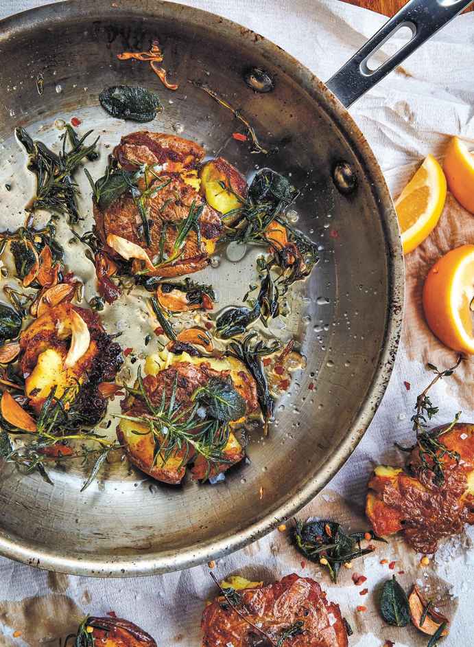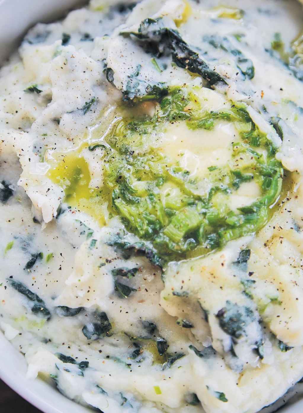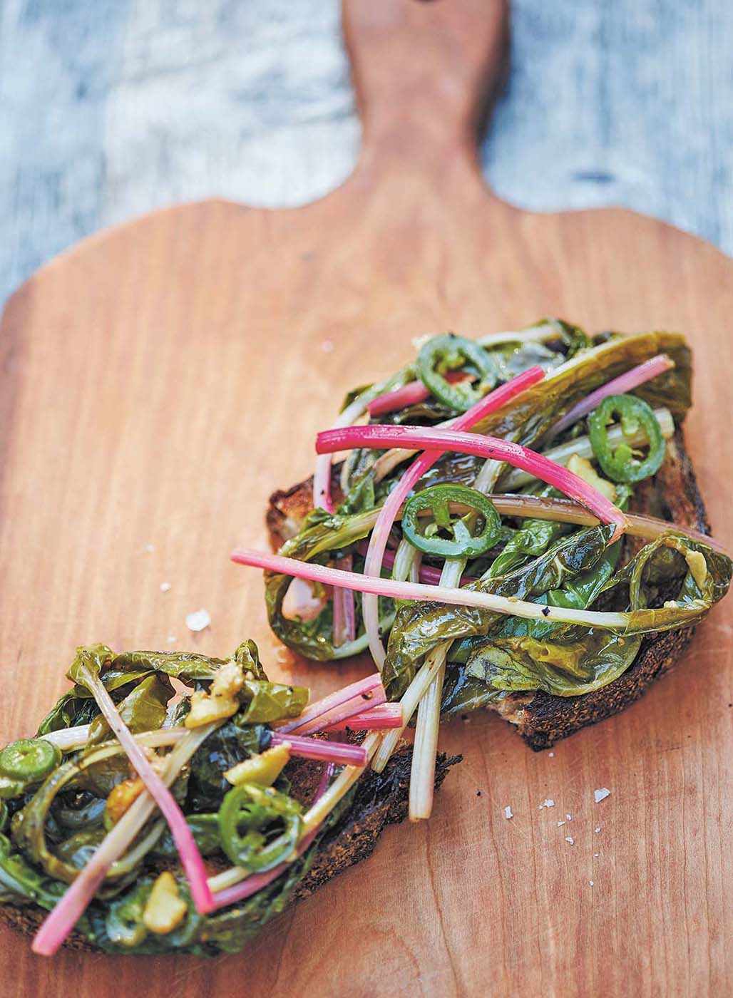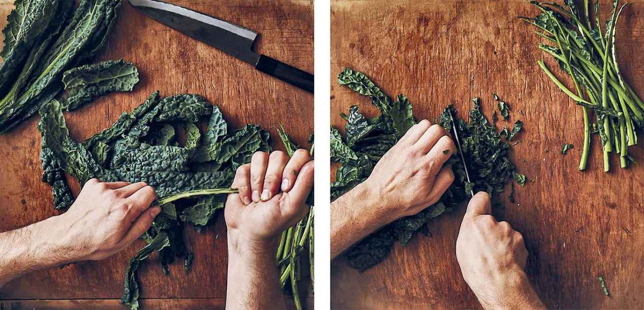 Here’s what I learned: Season (usually with salt, pepper, chile flakes, some kind of acid) before you add the fat, which in 95 percent of the recipes in this book will be olive oil. Dial in the flavors through a few rounds of tinkering, tasting, and tinkering again. The goal, says Joshua, is for the dish to taste “like a potato chip.” Meaning so tasty and savory that you can’t help but take one more bite . . . and then another.