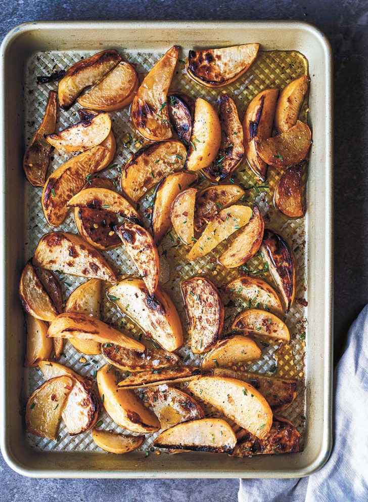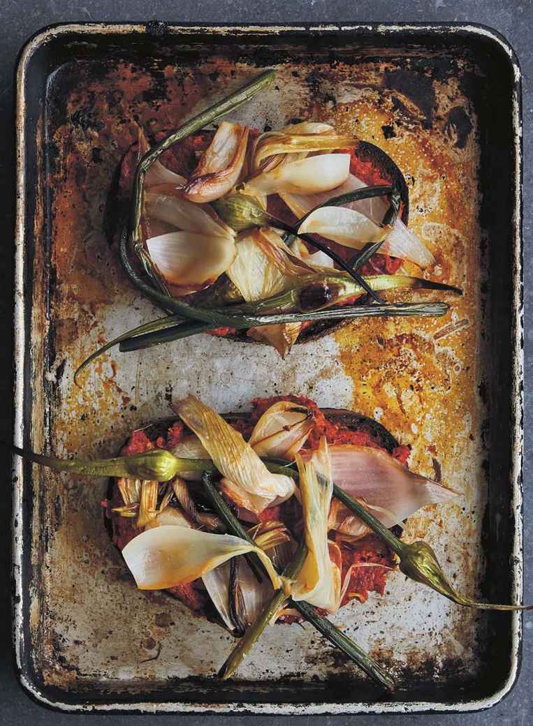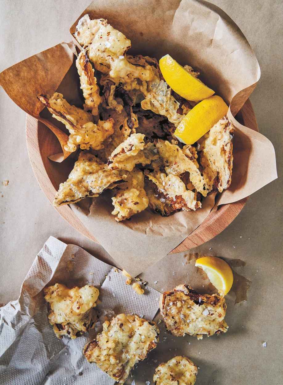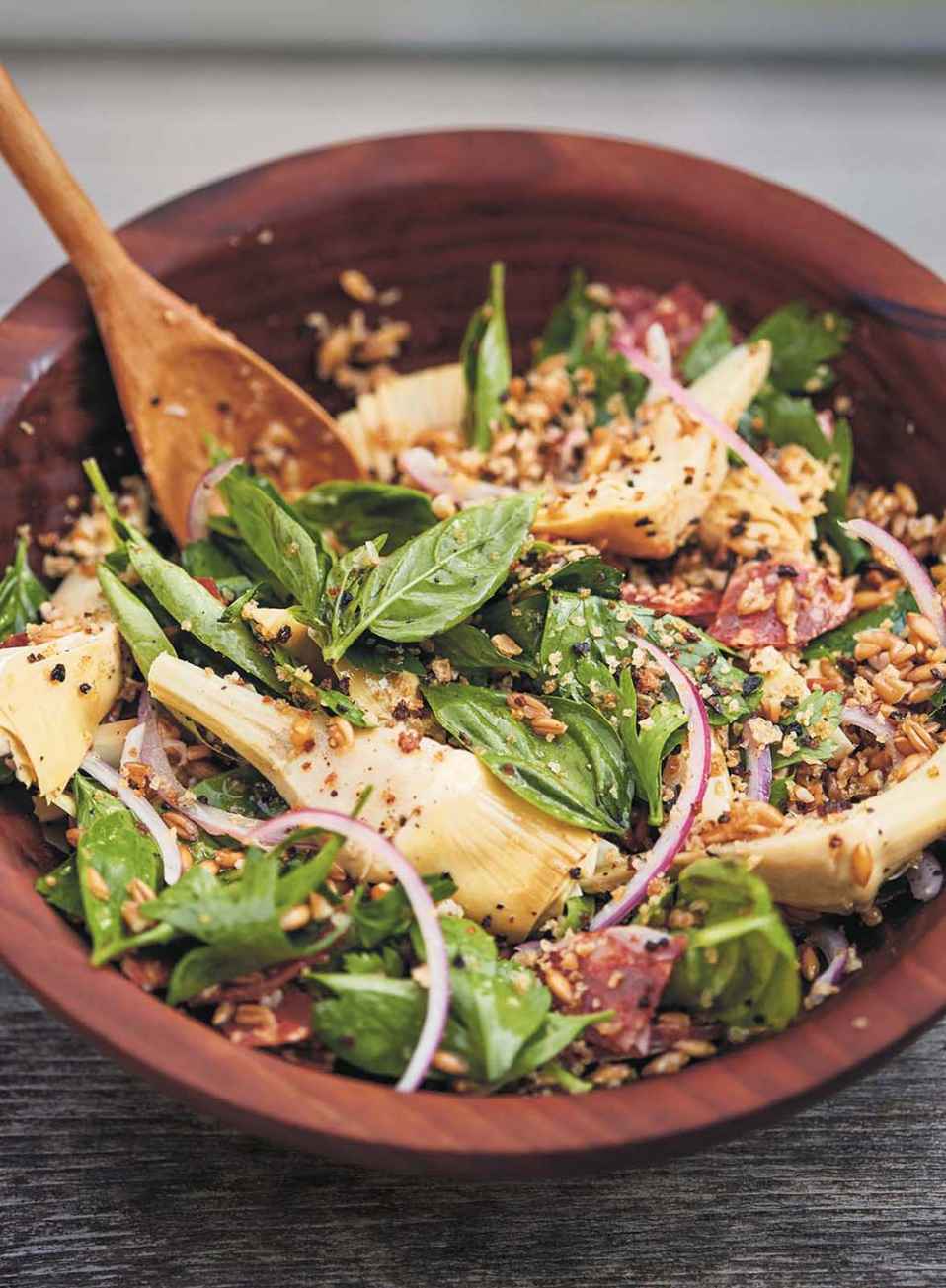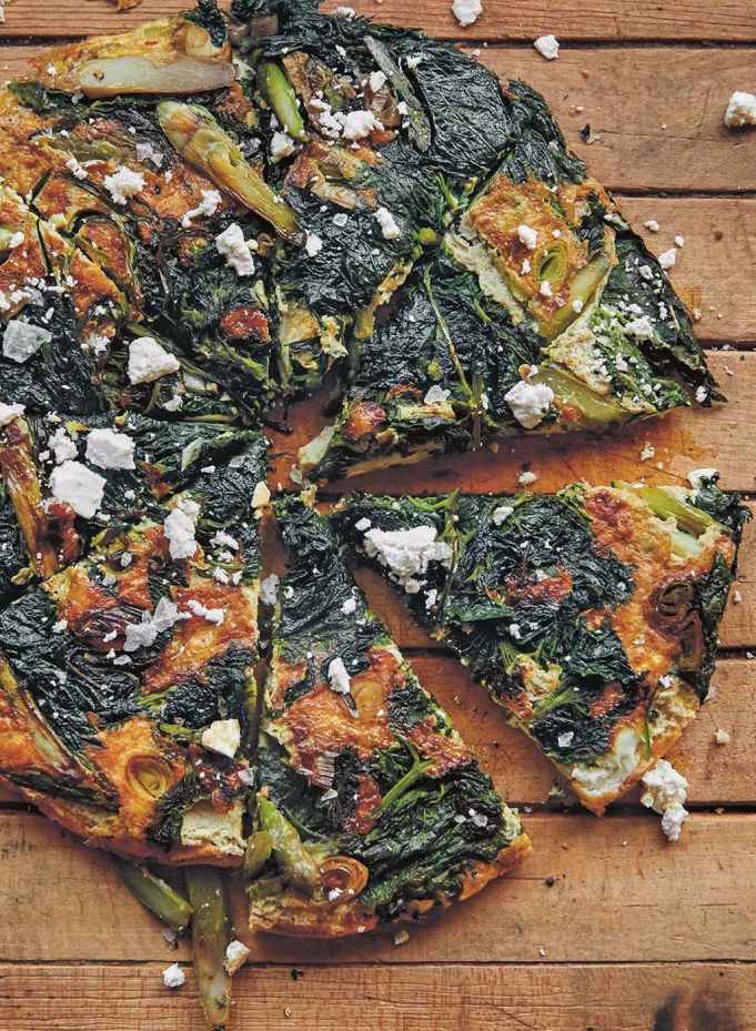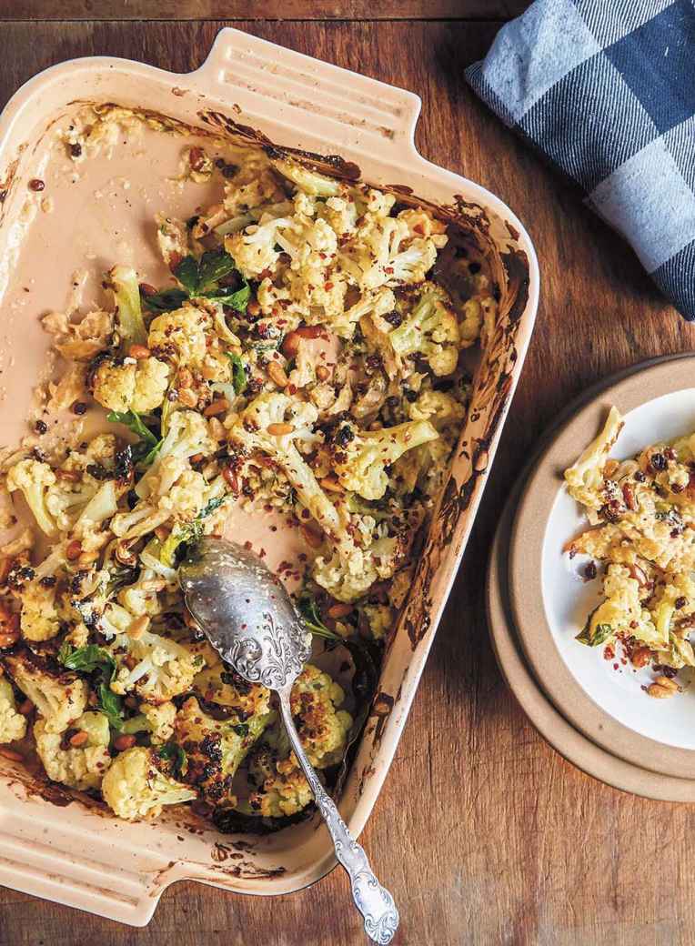 Here’s what I learned: Season (usually with salt, pepper, chile flakes, some kind of acid) before you add the fat, which in 95 percent of the recipes in this book will be olive oil. Dial in the flavors through a few rounds of tinkering, tasting, and tinkering again. The goal, says Joshua, is for the dish to taste “like a potato chip.” Meaning so tasty and savory that you can’t help but take one more bite . . . and then another.