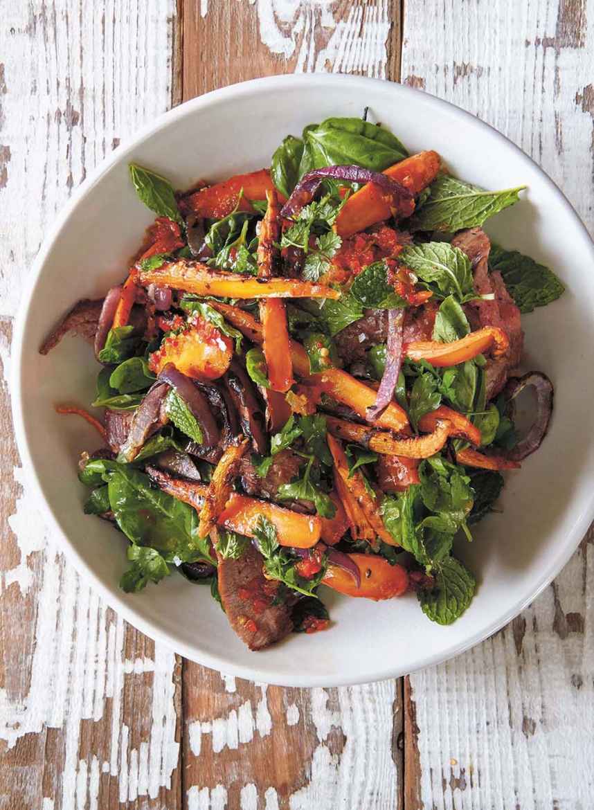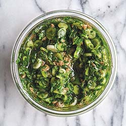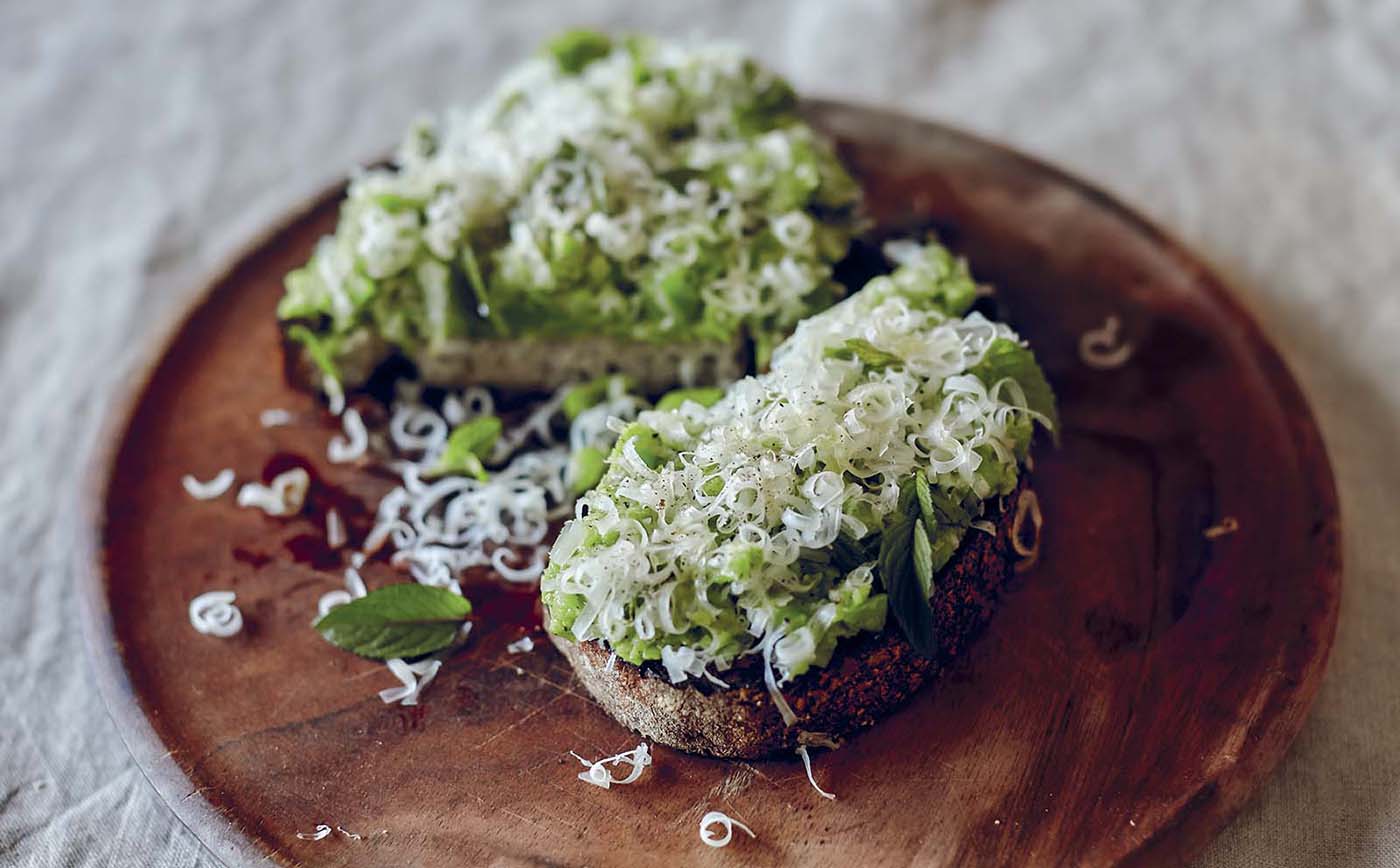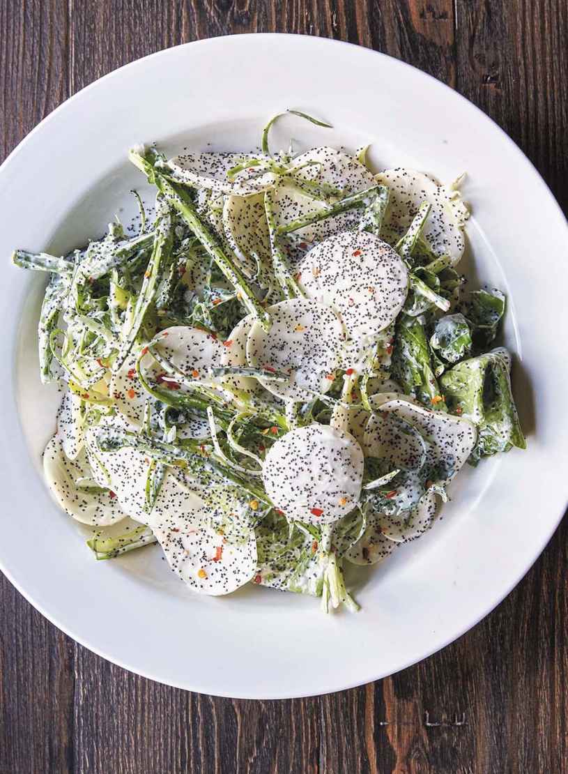 And as chefs are recognizing the old farmhouse virtues of eating nose-to-tail with meat so as not to waste any part of the animal, I aim for eating leaf-to-root with many vegetables. When you think “carrot,” you may think orange, but I also think green. Early in the year, carrots come with lacy tops that are delicious, such as in my Pan-Roasted Carrots with Carrot-Top Salsa Verde, Avocado, and Seared Squid. All roots have edible greens, so catch them early when they’re tender.