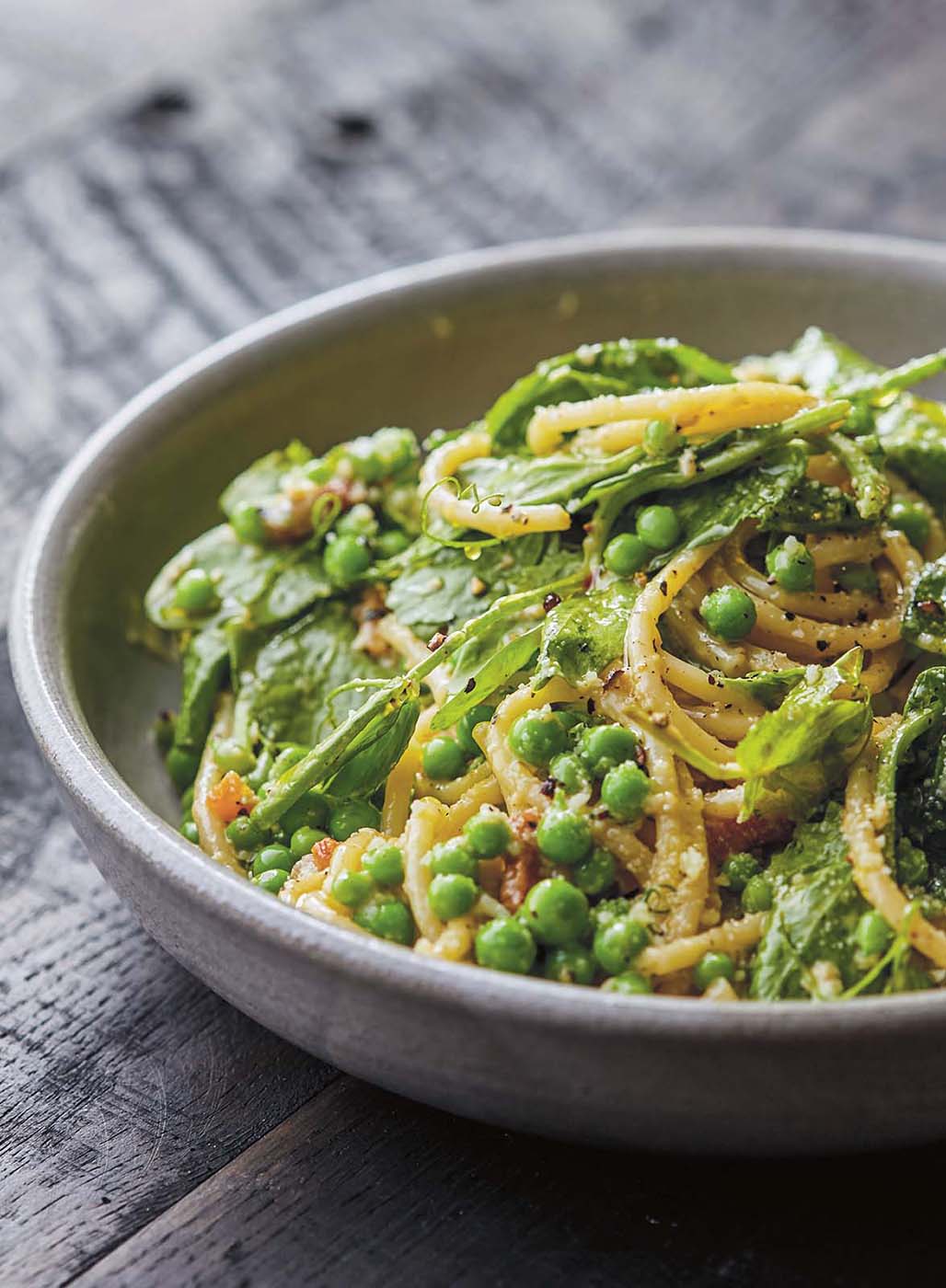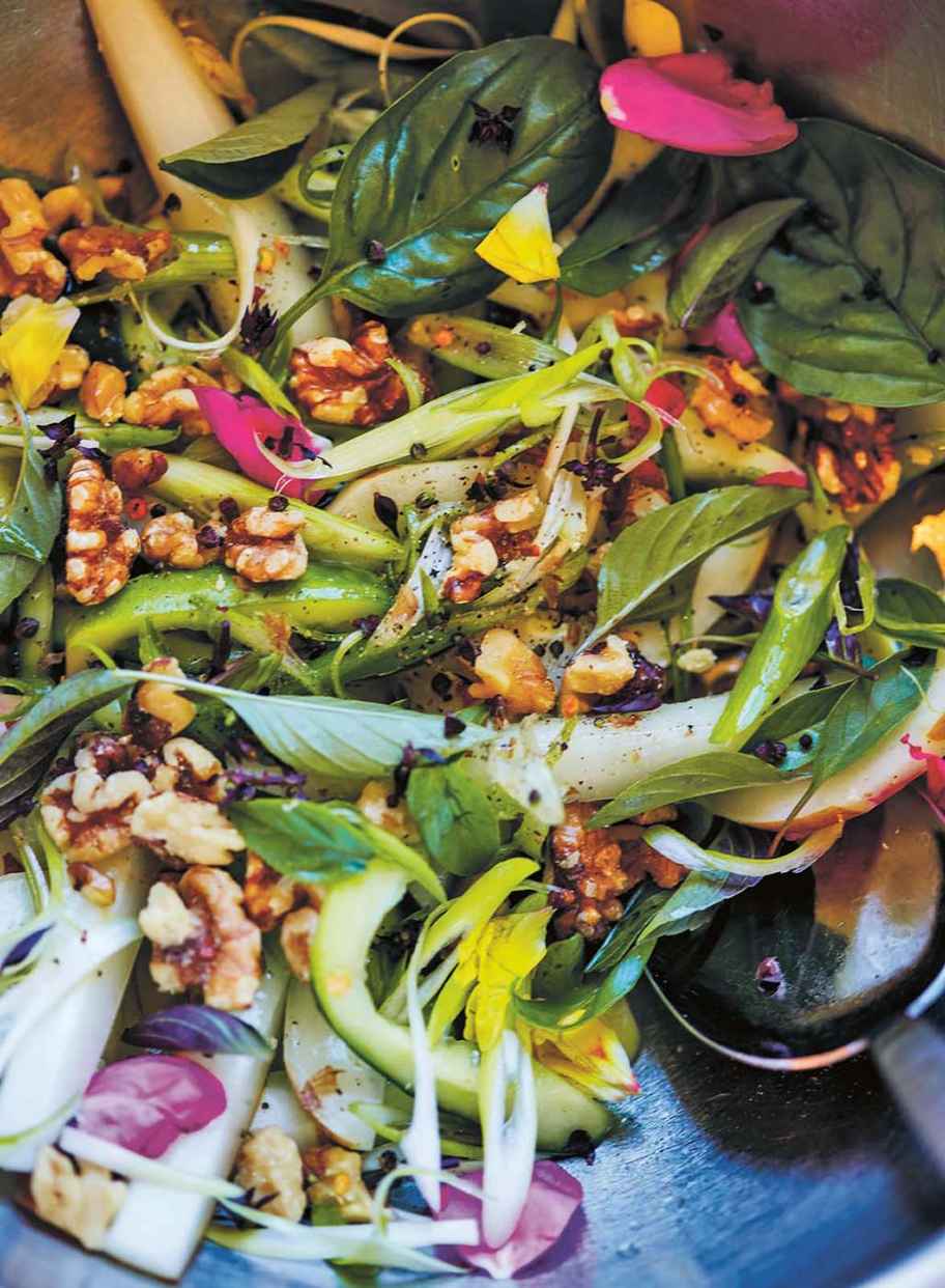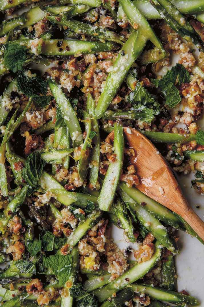In spring, you’ll find plenty of dishes with raw vegetables, fresh from the newly warmed earth and needing not much more than a slick of olive oil and a sprinkle of salt to showcase their green goodness. English peas piled high (and tumbling off) grilled bread slathered with fresh cheese. Raw asparagus sliced to emphasize its crunch, tossed with walnuts, Parmigiano, and olive oil. That’s what I want to eat in the first weeks of the regenerating earth.