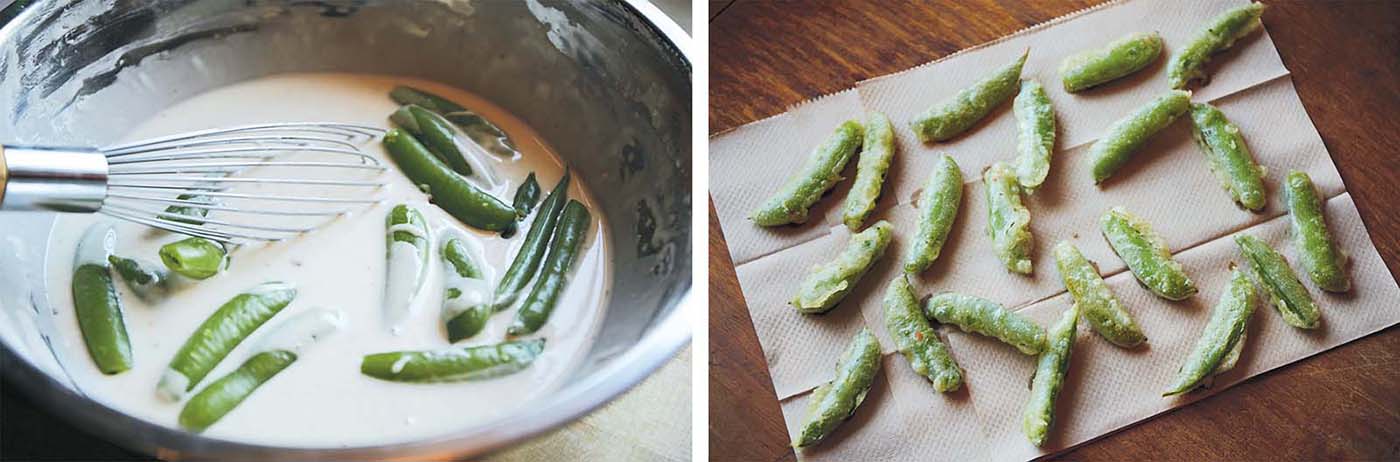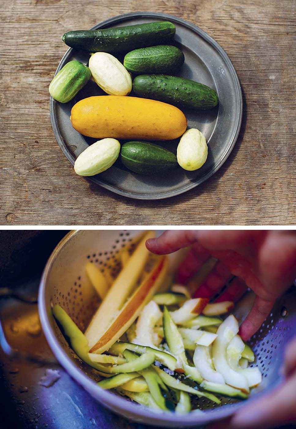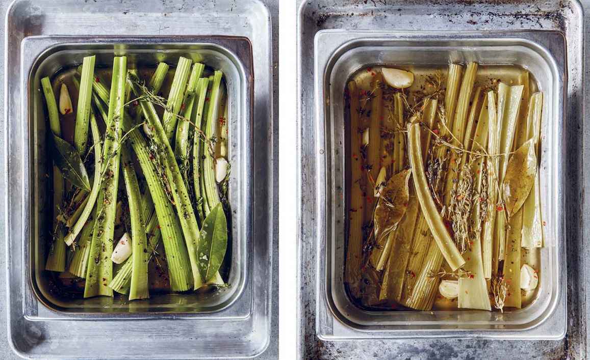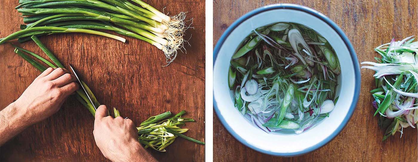 Melt a spoonful of the butter in a skillet, add the sliced green garlic and the salt, and cook over medium-low heat. You want to soften both the texture and the intense flavor but you don’t want to brown the garlic at all; this should take around 10 minutes.