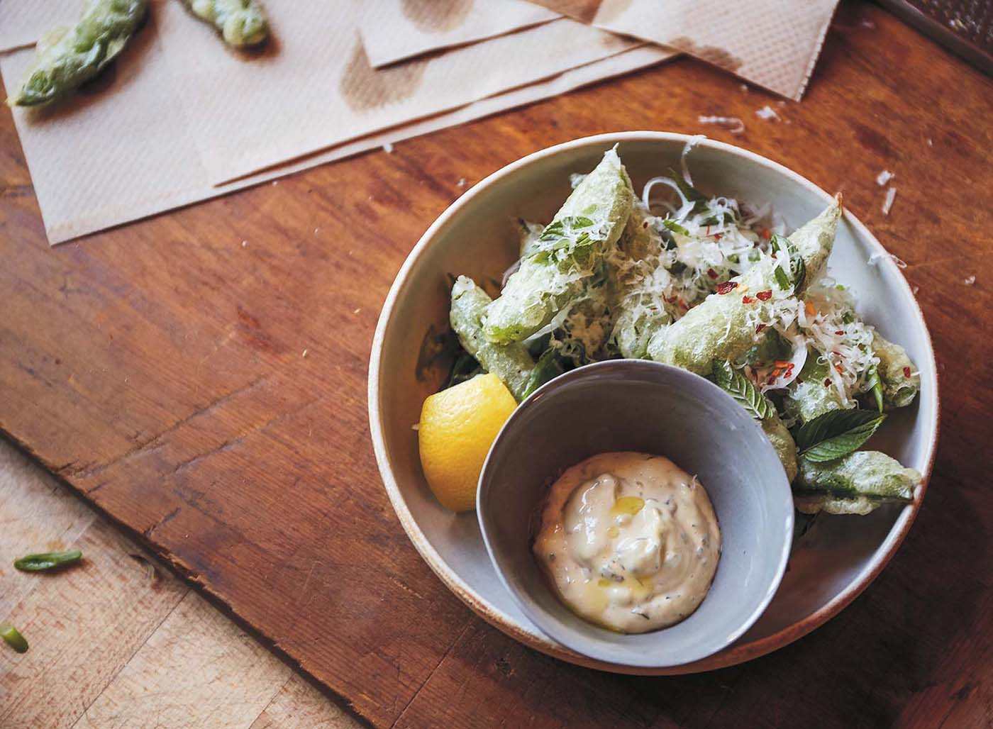 From left: Cacio e pepe , watercress , pickled vegetable , alla diavola , green garlic , and mushroom butters