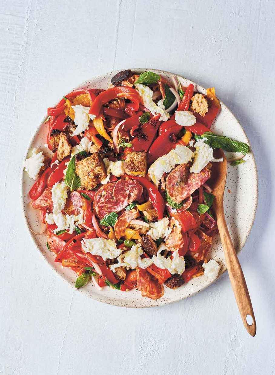 What you don’t want are hard croutons. You always want a little bit of chew in the center, not on every single one, but every third one at least; the lack of uniformity helps this. You also want the croutons to absorb the juices from vegetables, the extra-virgin olive oil, the vinaigrettes . . . All that flavor is carried into the crouton better through the torn edges.