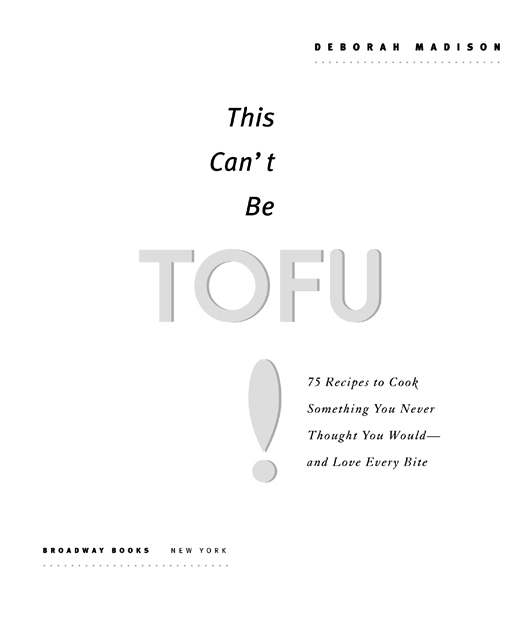 , in particular, my favorite tofu eater, Patrick McFarlin, who kept saying, “This can’t be tofu!” and thus named the book; Anne Marie Bough who cheerfully added recipe testing to her already demanding job as a line cook; Mark Mattern of Disney World, whose enthusiasm got me to enjoy my first of many tofu smoothies; Cheryl Jamison, who shared her considerable knowledge of smoke and spice, resulting in barbecued tofu; Harriet Bell, editor par excellence, who asked if I knew anyone who might want to write a little book on tofu and thus piqued my interest; and to my indefatigable agent, Doe Coover, for once again moving an idea toward becoming a book.