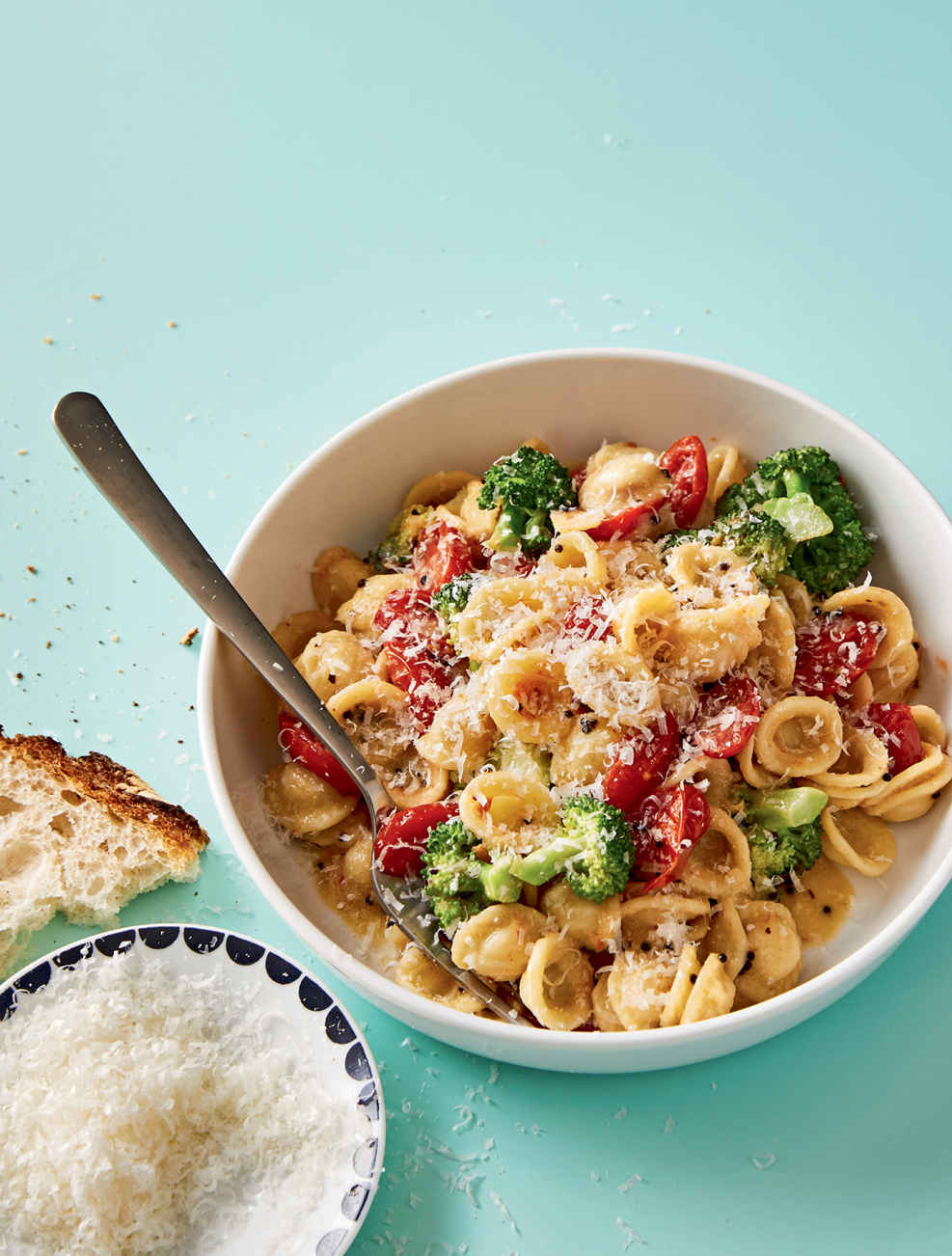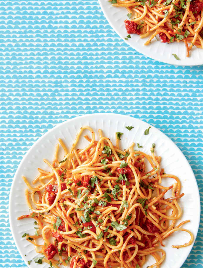 1 Fill a large pot halfway with water and bring to a boil over high heat (less water makes for starchier pasta water and this will help your sauce cling to the pasta). Add 1 tablespoon of salt and the pasta and cook according to the package directions until the pasta is just shy of al dente (it should taste like it still needs 1 minute longer in the pot—it will be somewhat solid white at the core of a strand). Reserve 1 cup of the pasta water, then drain the pasta through a fine-mesh sieve. Return the reserved pasta water to the pot.