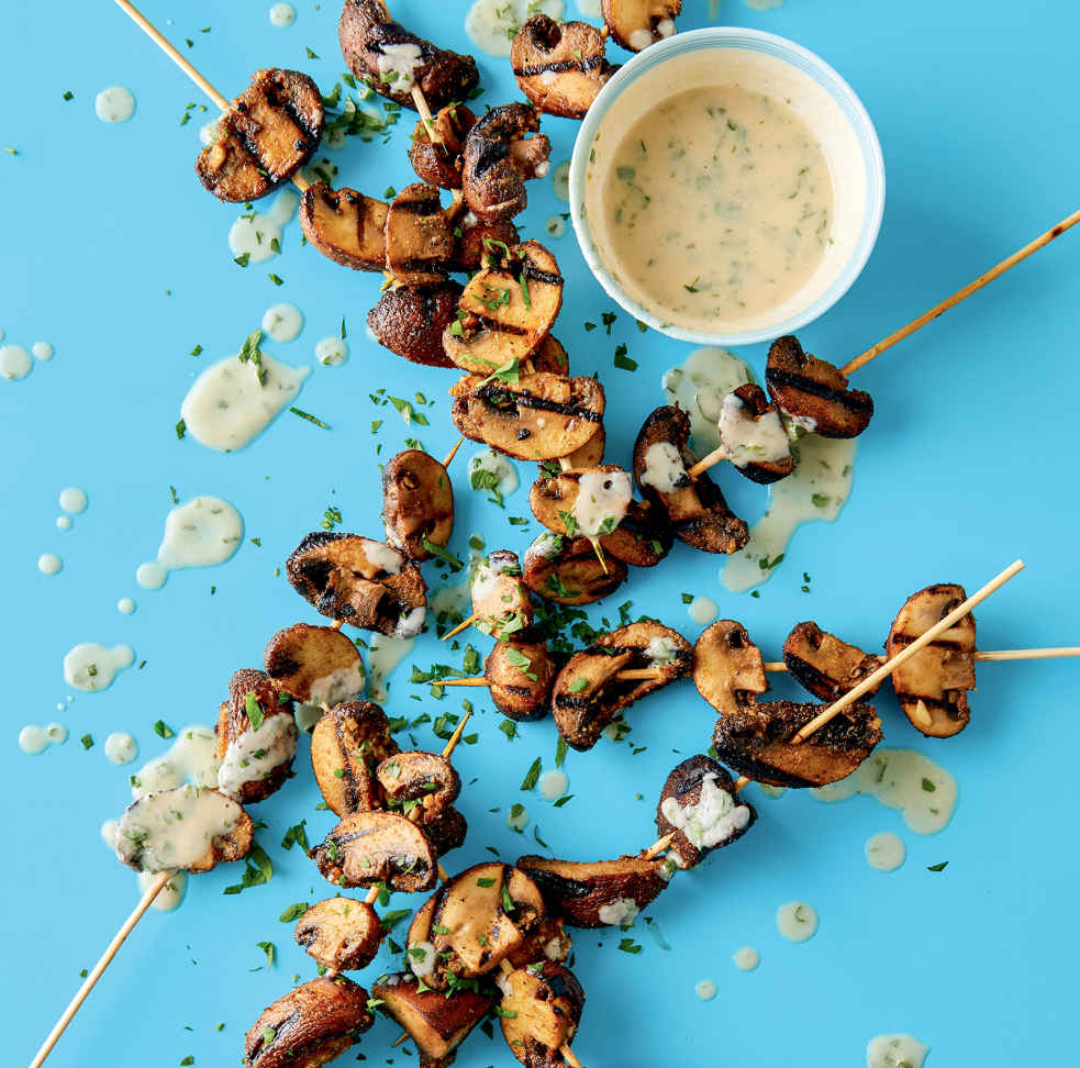Falafel-Spiced Grilled Mushrooms with Miso-Tahini Dressing