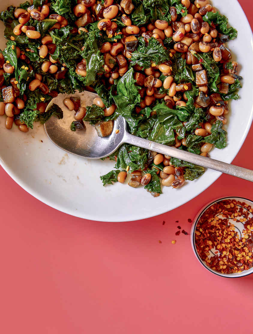 Mushroom Lardons with Black-Eyed Peas and Greens