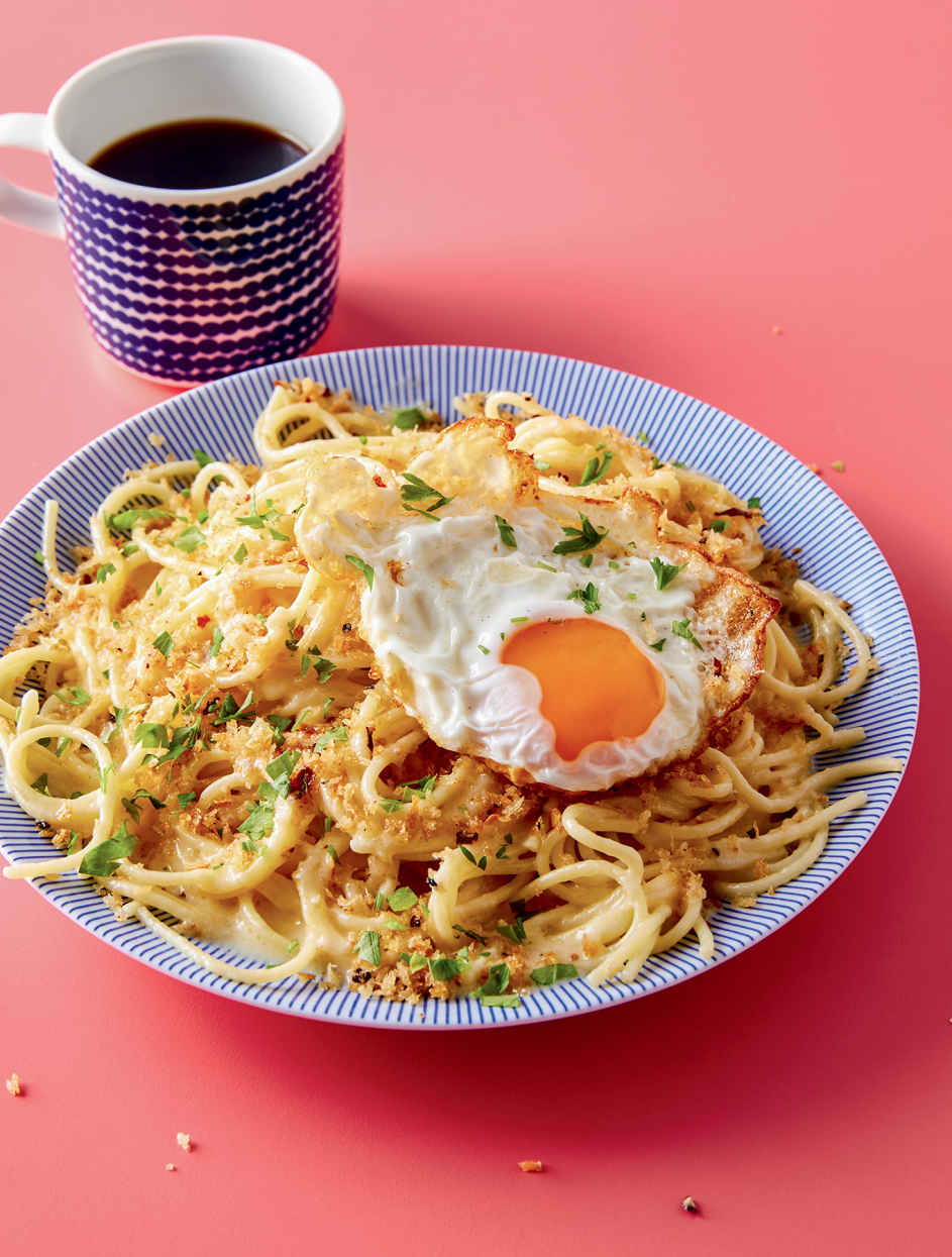 4 While the eggs cook, finish the pasta: Place the pot with the reserved pasta water over high heat. Once the water starts to bubble, add the remaining 1 tablespoon butter and 2 tablespoons olive oil along with the drained pasta. Cook, stirring often to coat the pasta, for 45 seconds. Stir in the cheeses, chives, and 1 teaspoon of salt and divide among four bowls. Sprinkle with the bread crumb mixture, top each serving with an egg, and serve immediately.