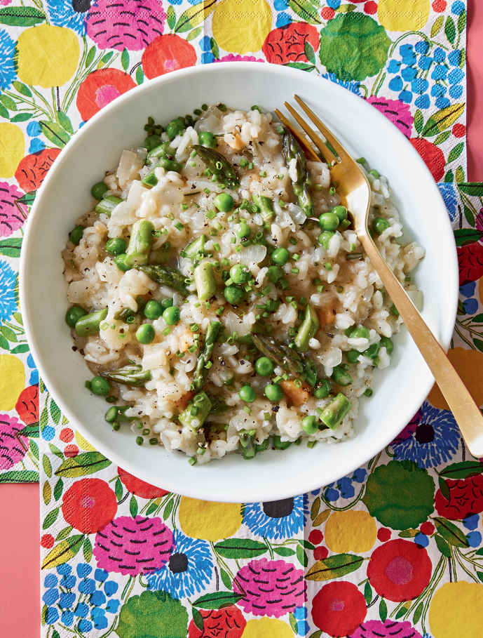 Springtime risotto with aged Gouda, asparagus, and peas