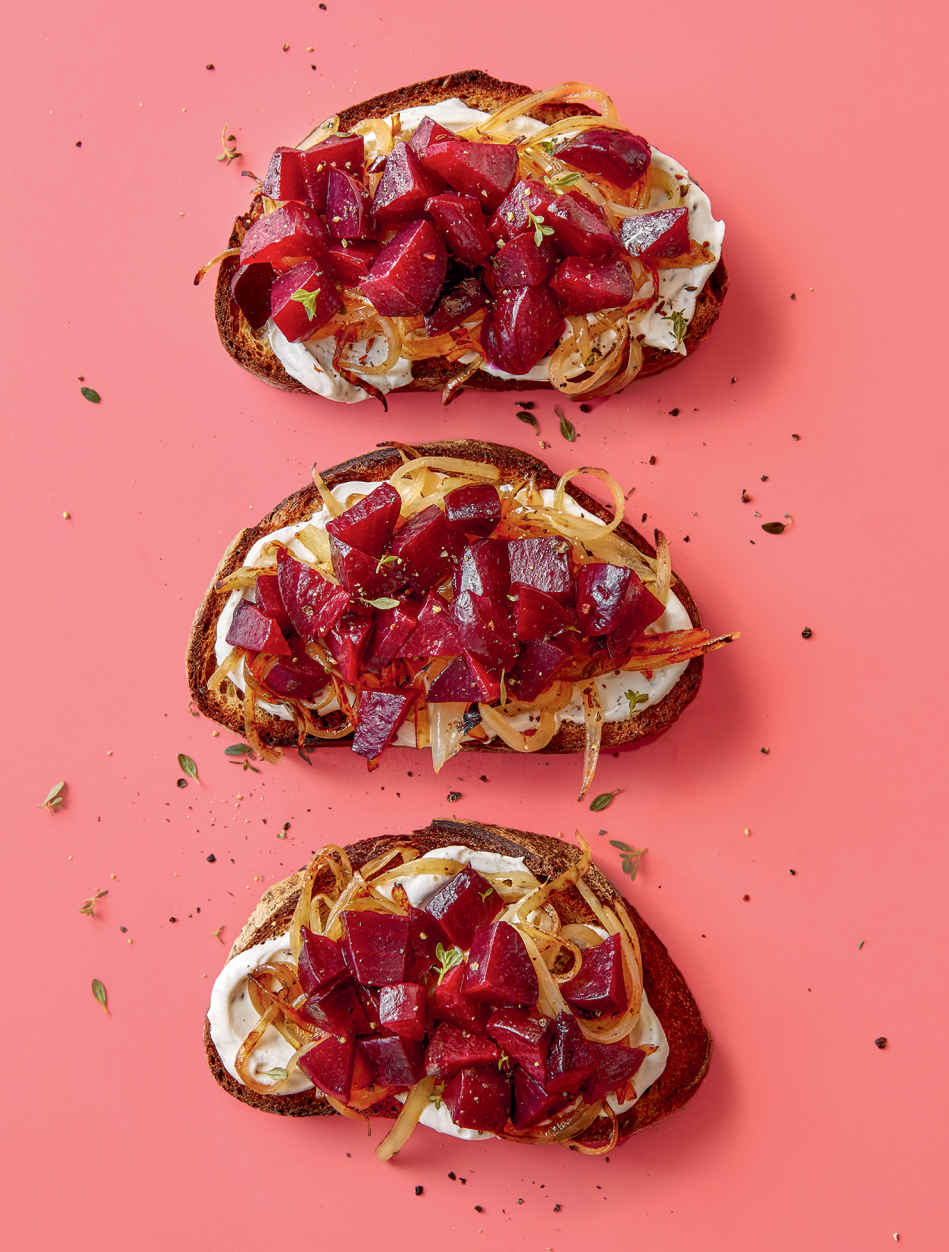 Caramelized Onion Toast with Beets, Toasted Caraway, and Labne