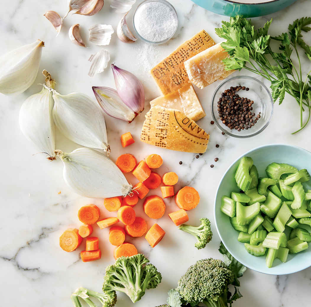 The heel of a wedge of Parmigiano-Reggiano is a magnificent source of flavor. When I’m grating Parm and come to the heel (aka the rind), I drop it into a ziplock bag and stash it in the freezer for up to a year (or let’s be honest, two!). When I need a vegetarian broth, the “bones” are there waiting for me to turn them into this silky, rich, deeply nurturing broth—delicious on its own or used as the foundation for any soup you can dream up. (If you don’t have the Parm heels on hand, you can buy a wedge, cut off the part good for grating, and just use the rind to make the broth.)